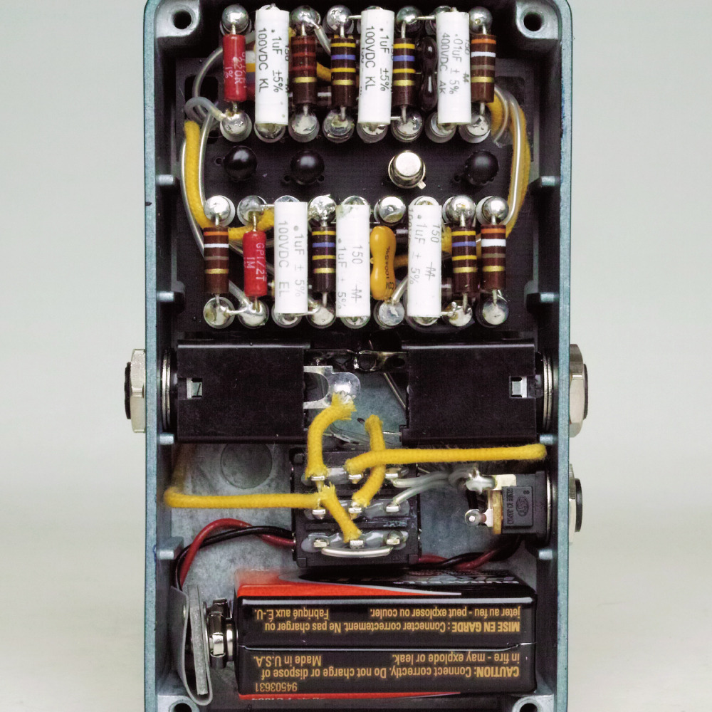 サウンドに関しては、ヴィンテージの再現というものとは異なっており、BIGMUFF特有のミッドレンジカットや、多段でのクリップによるピッキングやギターボリュームへの反応性…などのポイントに着目し、実際にアンサンブルの中で使用する状況を想定し積極的にモディファイを施しています。そんななかロシア製の特徴である、ローエンドの強い押し出し、またこのタイプのファミリーの中でも比較的低めに設定されているゲインレベルといったポイントはそのまま変更する事なく、チューニングをしています。